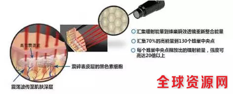 皮秒镭射激光是采用激光并搭配蜂巢瞬效透鏡(Focus)將70%雷射能量汇集聚焦,每发雷射光提供皮肤组织10%的高效震荡波作用,震碎表皮层的黑色素細胞,同時更将震荡波传导至深层真皮层,启动修复生長因子,促进胶原蛋白和弹性纤维的更新与增生,加速皮肤的新陈代谢,使黑色素加速代谢排出体外,从而从根源上解决深层色素问题。